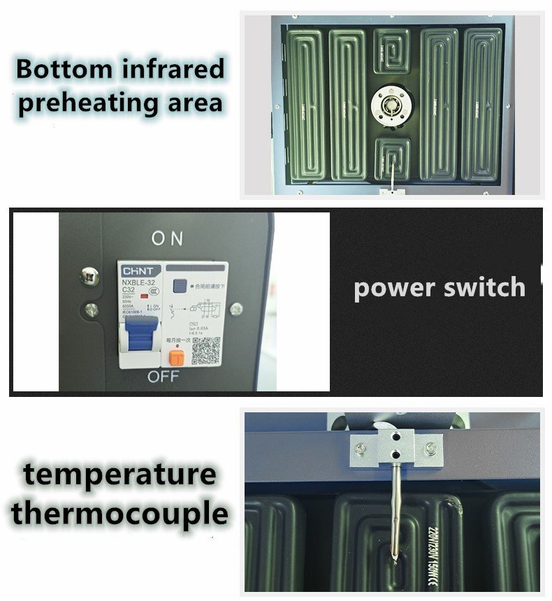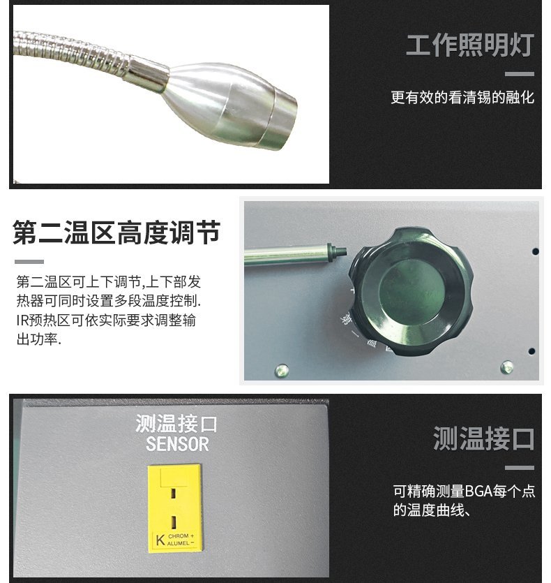 sistema de retrabajo de nivel de entrada para SMD normal, BGA, QFP, CSP, zócalos, componentes Micro-SMD, etc. Soporta chips de tamaño Max. 80mm x 80mm, Min. 3mm * 3mm. Placa base PCB Max. 620mm x 520mm