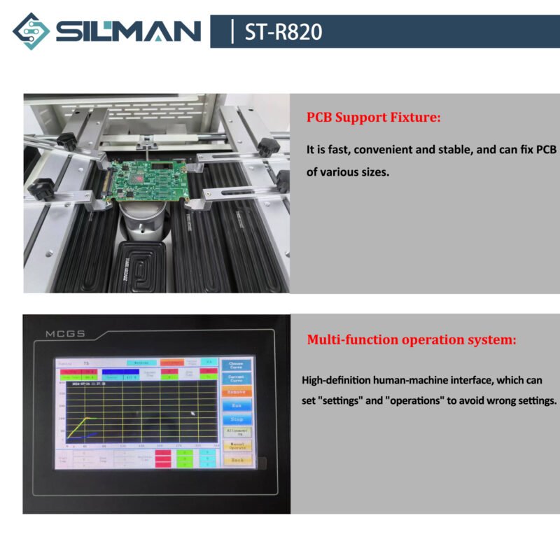Паяльные станции ST-R820 SMD/BGA оснащены новейшими технологиями машинного зрения и термического управления процессами. Печатные платы и подложки, состоящие из таких компонентов, как BGA, CSP, QFN, флип-чипы, опора P08 Светодиодные бусины с малым шагом, мин. 2 мм * 2 мм IC.